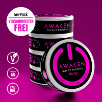 Dein fruchtiger Kick hoch 5! Mit unserem Vorteilspackage der AWAKEN ENERGY POUCHES BERRY holst du dir den fruchtig leckeren Wachmacher gleich 5-mal nach Hause – versandkostenfrei!