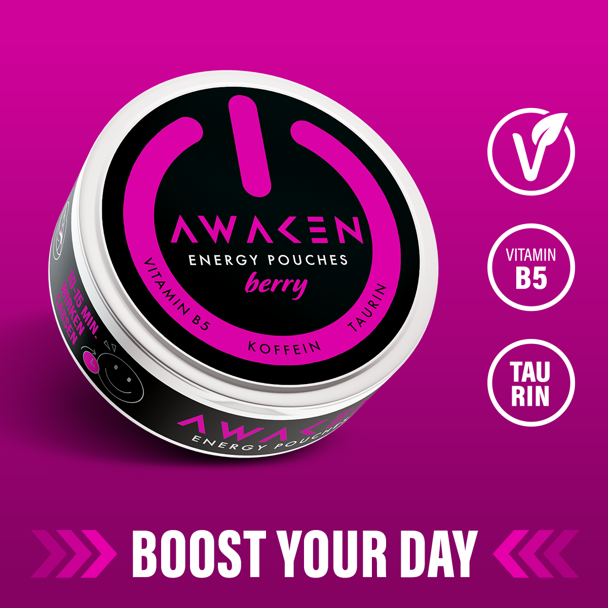 Als fruchtige Mischung aus saftigen Beeren geben sie dir einen natürlichen intensiv fruchtigen Kick. Sie sind dabei nicht nur vegan, ohne Nikotin und ohne Zucker, sie beinhalten außerdem Vitamin B5 und Taurin! Und mit 50 mg Koffein pro Pouch sind sie der Wachmacher, auf den du gewartet hast.