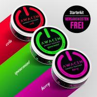 Deine Energie. Dein Geschmack. Deine Wahl! Erlebe unsere AWAKEN ENERGY POUCHES in den unwiderstehlichen Geschmacksrichtungen: Berry, Spearmint & Cola. Jetzt das Starterkit mit jeweils einer Dose sichern.