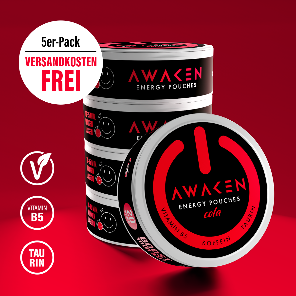 50 mg pro Pouch Koffein mit dem unwiderstehlichen Geschmack von Cola ist die unschlagbare Kombination, die dir deinen Kick gibt. Angereichert mit Vitamin B5, Taurin und dabei vegan und ohne Zucker: Das ist AWAKEN.