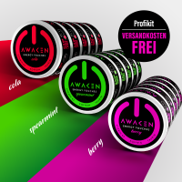 Dein ultimativer Energiekick. Extended version! Hol dir alle drei Sorten unserer AWAKEN ENERGY POUCHES mit jeweils 5 Dosen versandkostenfrei nach Hause!